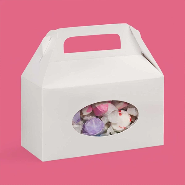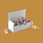 Highly protective 1 lb candy boxes with secured tops by folding down and tucking in 2 sides and 1 front flap. These boxes are usually designed with auto bottom features to be easily assembled